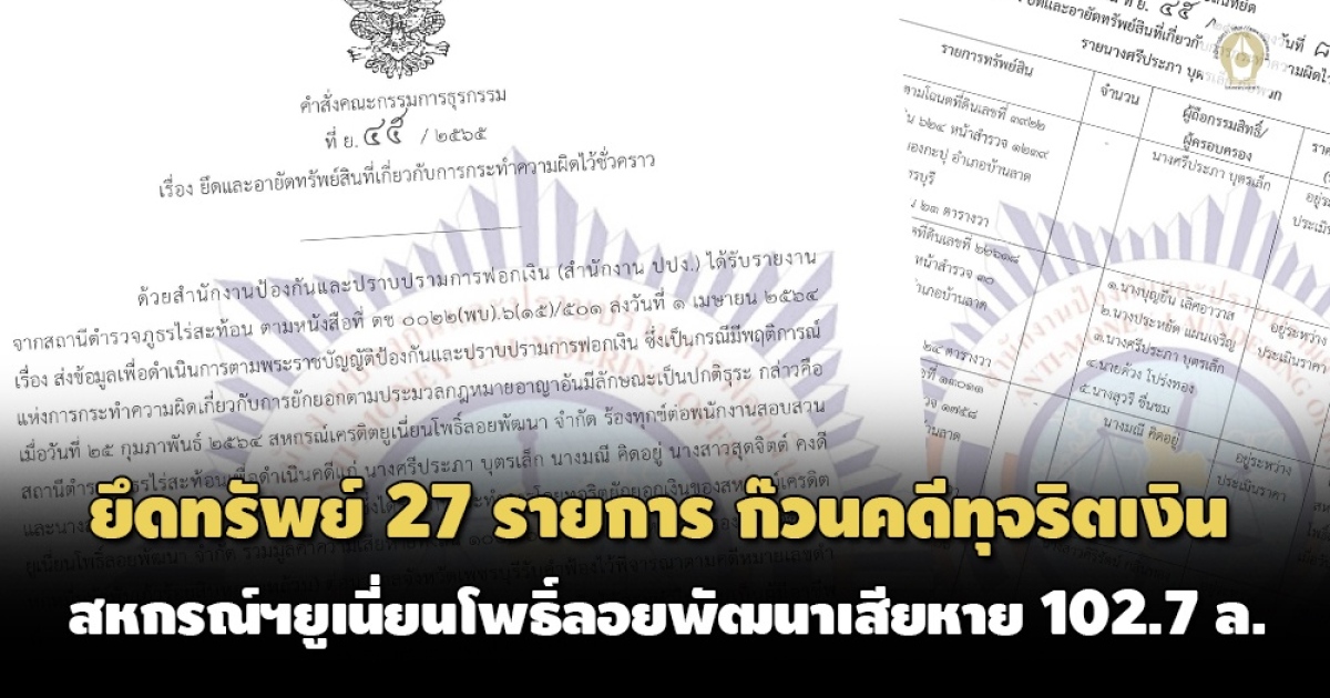 ปปง. สั่งยึดอายัดทรัพย์กลุ่มบุคคลผู้เกี่ยวข้องคดีทุจริตยักยอกเงิน สหกรณ์เครดิต ยูเนี่ยนโพธิ์ลอยพัฒนา จ.เพชรบุรี 27 รายการ 1.6 ล. หลัง แจ้งความพนักงานสอบสวน เสียหาย 102.7 ล. ที่ดิน 5 แปลง สิทธิเรียกร้องในกรมธรรม์ 22 รายการ