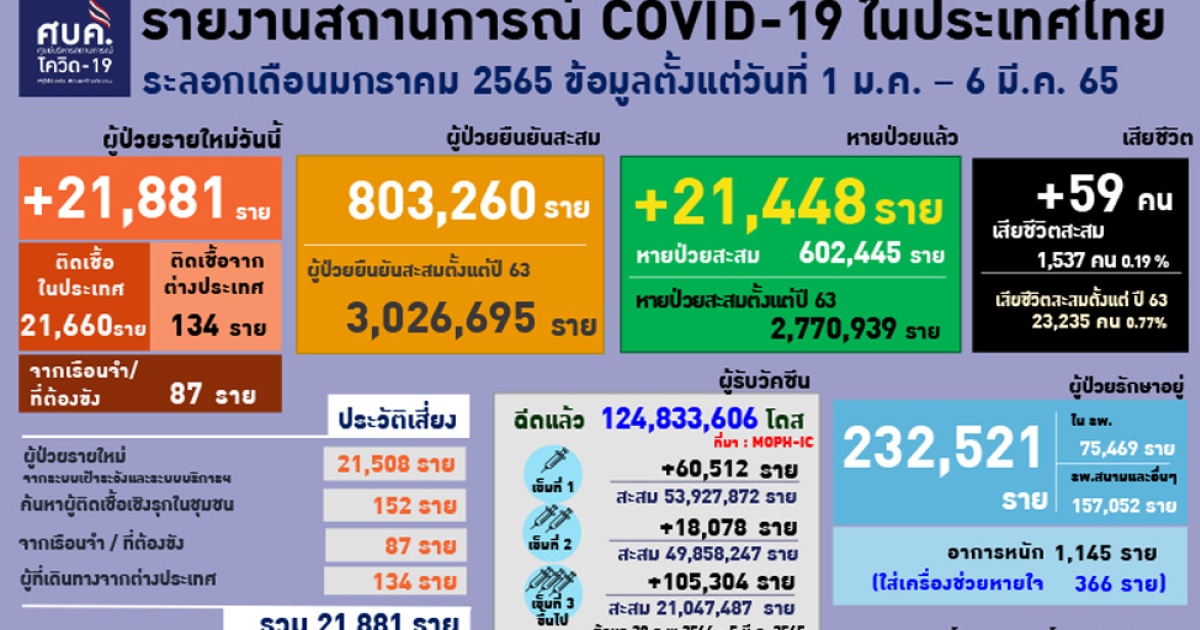 สำนักข่าวอิศรา (www.isranews.org) รายงานว่า เมื่อวันที่ 6 มี.ค. 2565 ศูนย์บริหารสถาการณ์โควิด-19 (ศบค.) รายงานสถานการณ์ประจำวัน โดยพบผู้ป่วยรายใหม่ 21,881 ราย จำแนกเป็น ติดเชื้อในประเทศ 21,660 ราย เกิดจากระบบเฝ้าระวังและระบบบริการฯ 21,508 ราย เกิดจากการค้นหาเชิงรุกและพบการติดเชื้อในชุมชน 152 ราย ติดเชื้อภายในเรือนจำ 87 ราย อีก 134 รายเดินทางกลับมาจากต่างประเทศ รวมผู้ป่วยสะสม 3,026,695 ราย