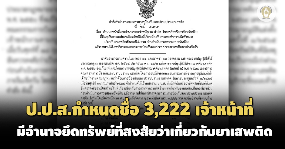 ป.ป.ส.ออกคำสั่ง กำหนดรายชื่อเจ้าพนักงาน 3,222 รายจาก 15 หน่วยงาน มีอำนาจยึดหรืออายัดทรัพย์ที่สงสัยว่าเป็นเกี่ยวข้องกับยาเสพติดเป็นกรณีเร่งด่วน ก่อนดำเนินการตรวจสอบแล้วรายงานเลขาฯ ป.ป.ส.ภายใน 7 วัน