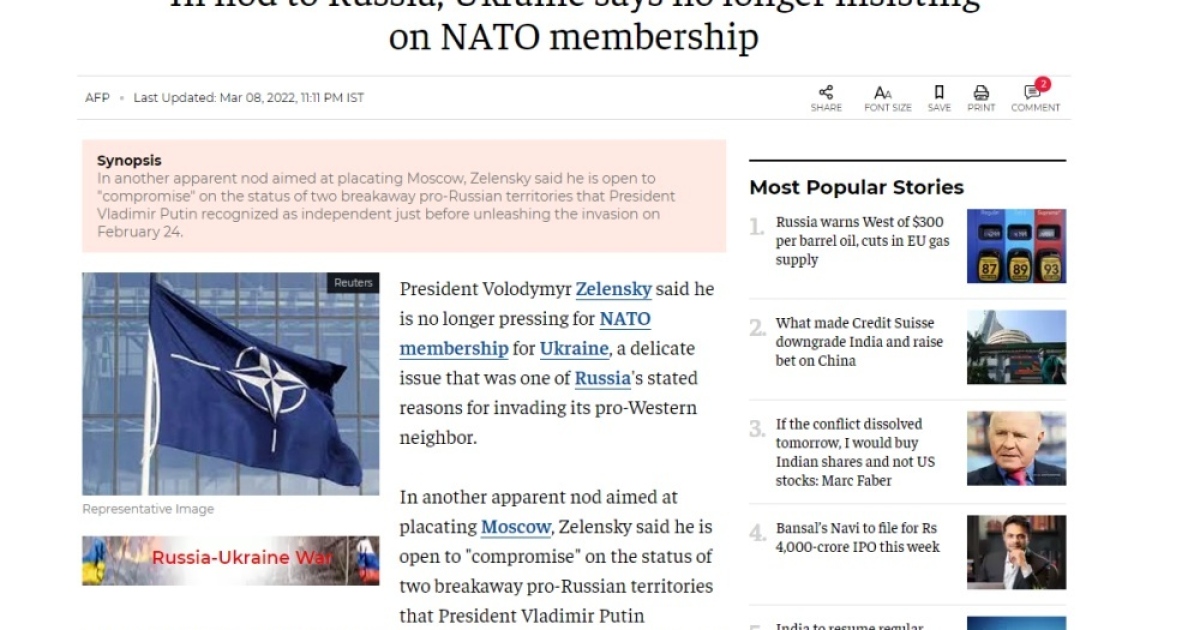 สำนักข่าวอิศรา (www.isranews.org) รายงานสถานการณ์วิกฤติในประเทศยูเครนว่านายโวโลเมียร์ เซเลนสกี้ ประธานาธิบดียูเครนได้ออกมายอมรับแล้วว่าตัวเขาจะไม่กดดันในเรื่องการนำเอาประเทศยูเครนเข้าเป็นสมาชิกขององค์การสนธิสัญญาป้องกันแอตแลนติกเหนือหรือว่านาโต้อีก ซึ่งประเด็นนี้ถือว่าเป็นประเด็นที่ละเอียดอ่อนอันเป็นเหตุทำให้ประเทศรัสเซียเข้ารุกรานเพื่อนบ้านที่เข้าหากับฝั่งตะวันตก