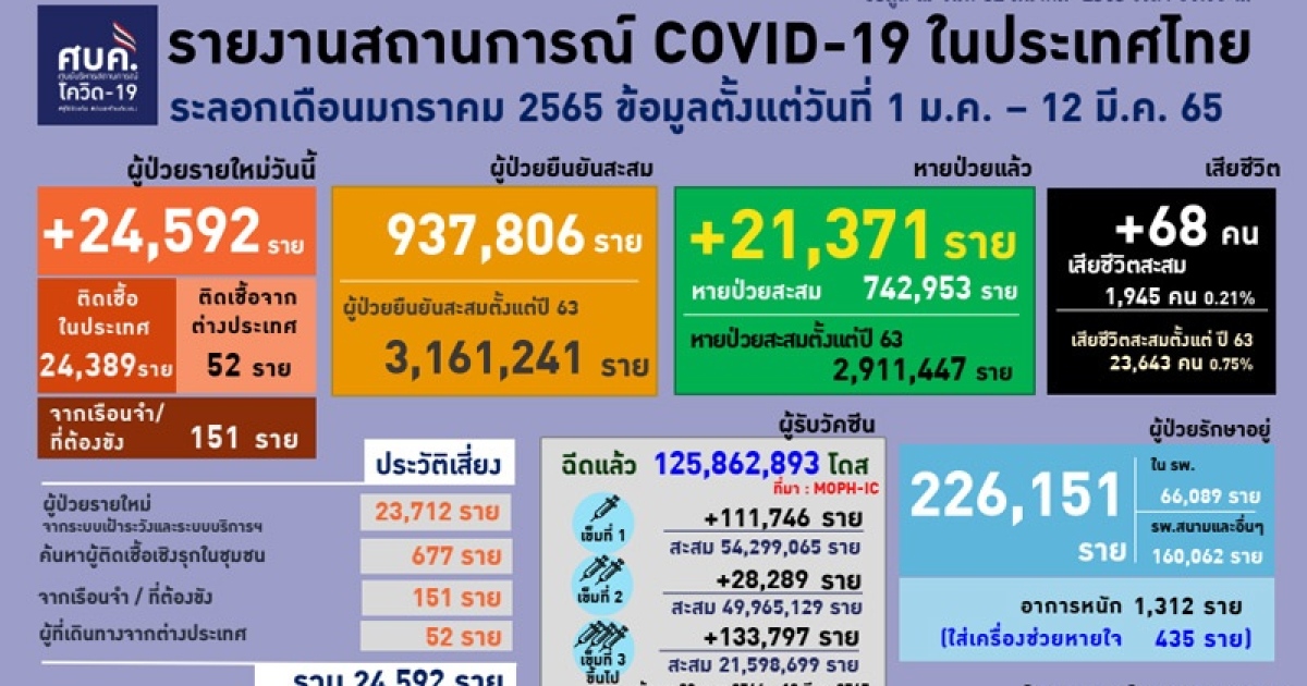 สำนักข่าวอิศรา (www.isranews.org) รายงานว่า เมื่อวันที่ 12 มี.ค. 2565 ศูนย์บริหารสถาการณ์โควิด-19 (ศบค.) รายงานสถานการณ์ประจำวัน โดยพบผู้ป่วยรายใหม่ 24,592 ราย จำแนกเป็น ติดเชื้อในประเทศ 24,540 ราย เกิดจากระบบเฝ้าระวังและระบบบริการฯ 23,712 ราย เกิดจากการค้นหาเชิงรุกและพบการติดเชื้อในชุมชน 677 ราย ติดเชื้อภายในเรือนจำ 151 ราย อีก 52 รายเดินทางกลับมาจากต่างประเทศ รวมผู้ป่วยสะสม 3,161,241 ราย