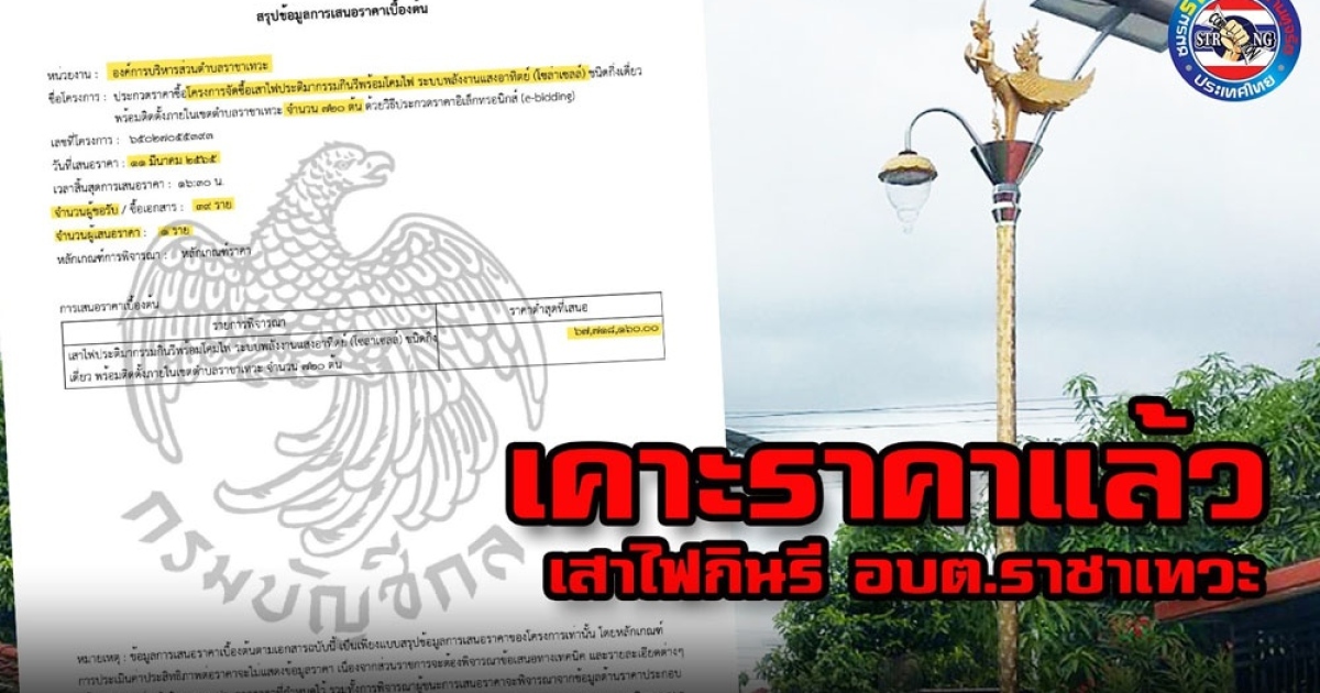 เพจ ชมรมSTRONGต้านทุจริตประเทศไทย แฉข้อมูลล่าสุด อบต.ราชาเทวะ เคาะราคาซื้อเสาไฟกินรี 720 ต้นแล้ว 11 มี.ค. ต่ำกว่าราคากลาง 67.7 ล.-ยื่นซองเจ้าเดียว จับตาผู้ชนะรายเดิมหรือไม่