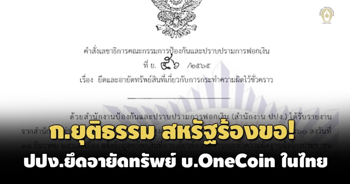 ปปง.ยึดอายัดทรัพย์สินเครือข่าย บ.OneCoin ในประเทศไทย 3 รายการ ทองคำแท่ง บัญชีเงินฝาก มิใช่บริษัทแลกเปลี่ยนเงินตราด้วยเงินเสมือนจริงที่ถูกต้องตามกฎหมาย ส่อฉ้อโกงประชาชน ฟอกเงิน เบื้องหลัง จนท.ก.ยุติธรรม สหรัฐประสานข้อมูลอัยการ จับตัวการผู้ก่อตั้งได้ที่เกาะสมุย ระบุเหรียญไม่สามารถซื้อขายในตลาดแลกเปลี่ยนเสรีได้ มีสํานักงานทั่วโลก
