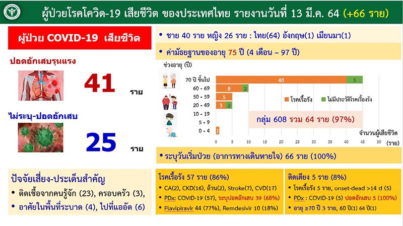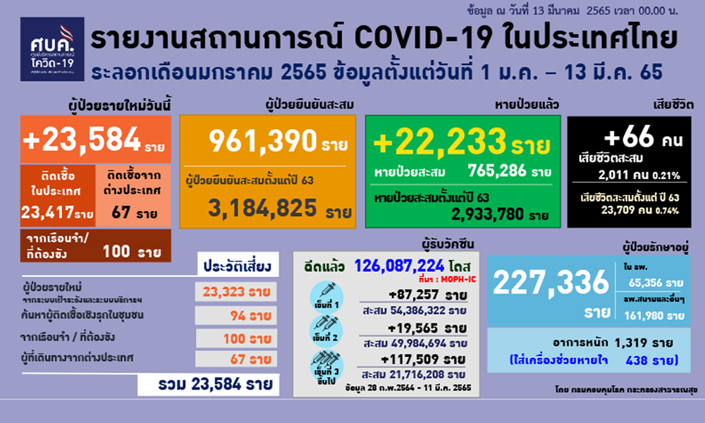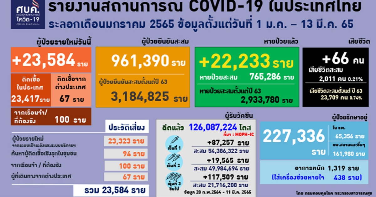 โควิดไทย 13 มี.ค. ติดเชื้อเพิ่ม 23,584 เสียชีวิต 66 พบยังฉีดไม่ครบโดส 40 ราย