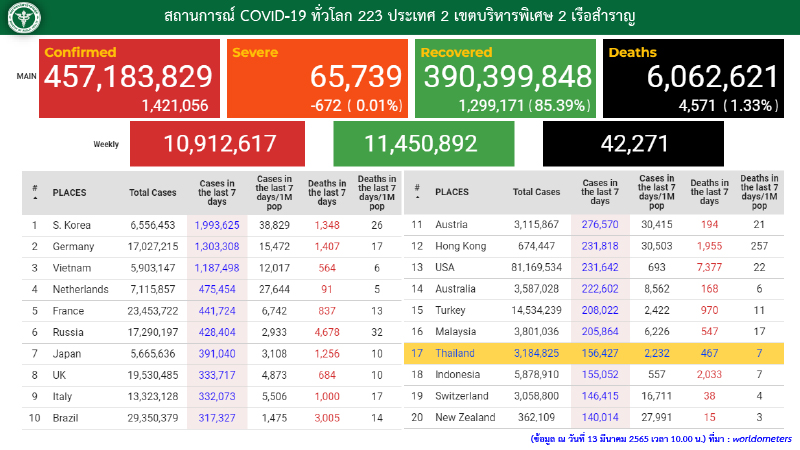 ขณะที่สถานการณ์ทั่วโลกพบผู้ป่วยเพิ่ม 1,421,056 ราย รวม 457,183,829 ราย อาการหนัก 65,739 ราย หายป่วย 390,399,848 ราย เสียชีวิต 6,062,621 ราย โดยประเทศที่พบผู้ติดเชื้อใหม่สูงสุด 3 อันดับ ได้แก่ เกาหลีใต้ พบผู้ป่วยใหม่ใน 7 วัน 1,993,625 ราย สะสม 6,556,453 ราย เยอรมนี พบผู้ป่วยใหม่ใน 7 วัน 1,303,308 ราย สะสม 17,027,215 ราย เวียดนาม พบผู้ป่วยใหม่ใน 7 วัน 1,187,498 ราย สะสม 5,903,147 ราย ส่วนไทยอยู่ในอันดับที่ 17 ของโลก