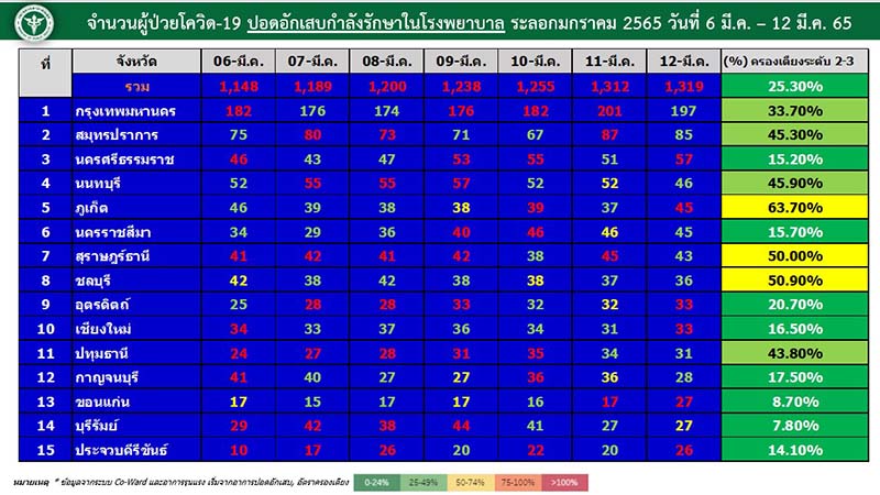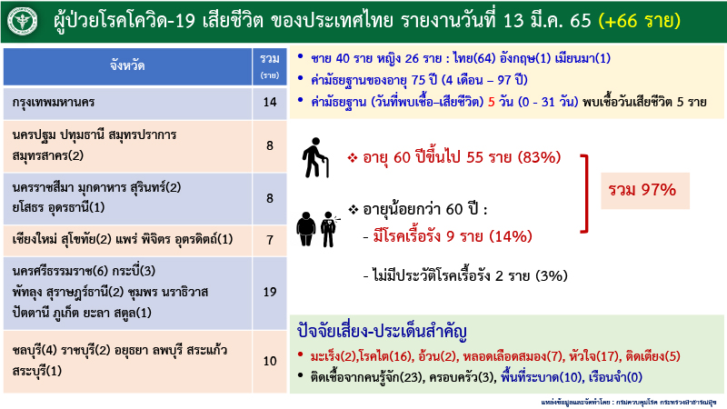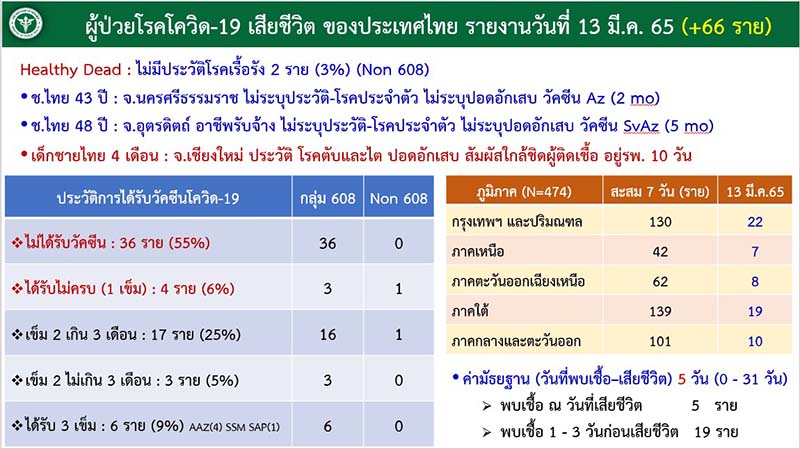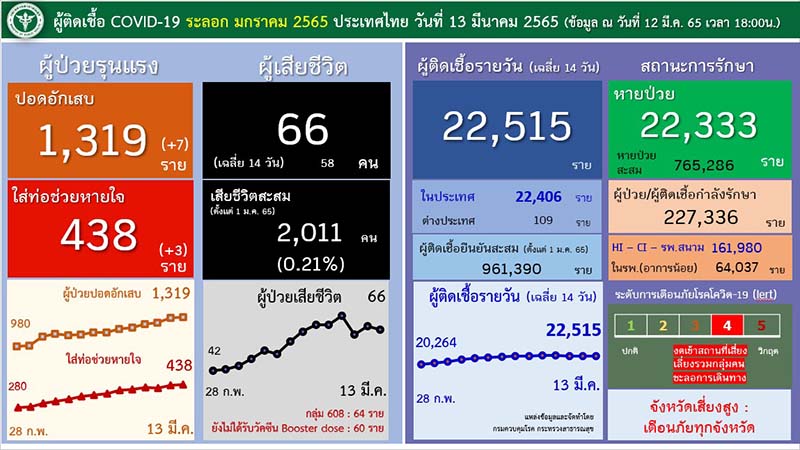 อนึ่งเมื่อเวลา 08.00 น. สำนักข่าวอิศรา (www.isranews.org) รายงานสถานการณ์การติดเชื้อไวรัสโควิด-19 ประจำวันที่ 13 มี.ค.2565 ว่า ในวันนี้มีผู้ติดเชื้อใหม่ทั้งสิ้น 23,584 ราย ส่งผลทำให้มีผู้ติดเชื้อใหม่นั้บตั้งแต่ปี 2565 ทั้งสิ้น 961,390 ราย มีผู้เสียชีวิตรายใหม่ 66 ราย ทำให้มีผู้เสียชีวิตสะสม 23,709 ราย สำหรับรายละเอียดผู้เสียชีวิตนั้น เเป็น ผู้ป่วยโรคไตระยะสุดท้าย16ราย เป็นมะเร็ง2รายเป็นผู้ป่วยติดเตียง5 ราย กลุ่ม608จำนวน64ราย(ร้อยละ97) ไม่ได้รับวัคซีนครบสองเข็ม40ราย ได้รับวัคซีนสองเข็มครบ 26 รายมีอาการติดเชื้อในปอดชัดเจน41 ราย ไม่มีอาการติดเชื้อในปอด25 ราย