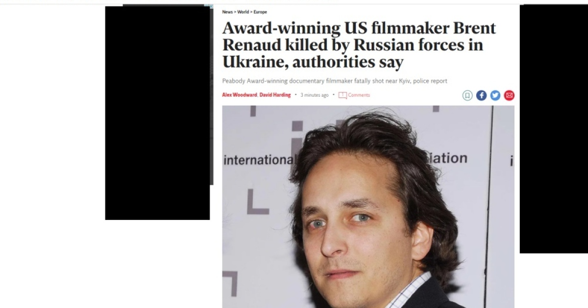สำนักข่าวอิศรา (www.isranews.org) รายงานสถานการณ์การสู้รบของรัสเซียและยูเครนว่าทางการยูเครนได้รายงานว่านายเบรนท์ เรอโนด์ ผู้กำกับภาพยนตร์ซึ่งได้รางวัลและยังเป็นอดีตผู้สื่อข่าวสำนักข่าวนิวยอร์กไทม์ของสหรัฐอเมริกาในวัย 51 ปี ที่ถูกยิงจนเสียชีวิตโดยกองกำลังรัสเซีนในเมืองไอร์พิน ใกล้กับกรุงเคียฟ ซึ่งการเสียชีวิตของนายเรอโนด์นั้นถือว่าเป็นผู้สื่อข่าวรายแรกที่เสียชีวิตในวิกฤติครั้งนี้