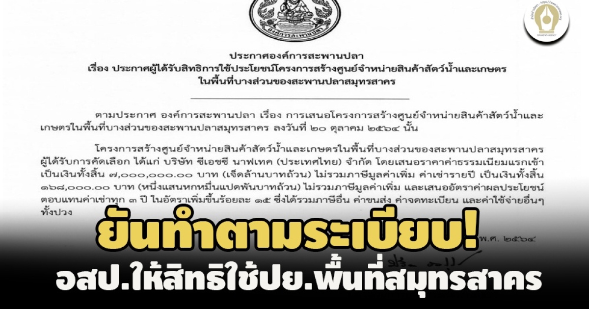 อสป. ประกาศชื่อ 'บ.ซีเอชซี นาฟเทค (ประเทศไทย)' ได้รับสิทธิการใช้ประโยชน์โครงการสร้างศูนย์จำหน่ายสินค้าสัตว์น้ำเกษตรในพื้นที่บางส่วนสะพานปลาสมุทรสาคร เสนอค่าธรรมเนียมแรกเข้า 7 ล้าน รายปี 168,000 บาท อัตราผลประโยชน์ตอบแทนทุก 3 ปี เพิ่มขึ้นร้อยละ 15 แต่โดนวิจารณ์หนักองค์กรดำเนินการเร่งรีบ -แถมได้ผลตอบแทนต่ำ ด้าน ผอ.ยันทำตามระเบียบทุกขั้นตอน ค่าตอบแทนเหมาะสมแล้ว