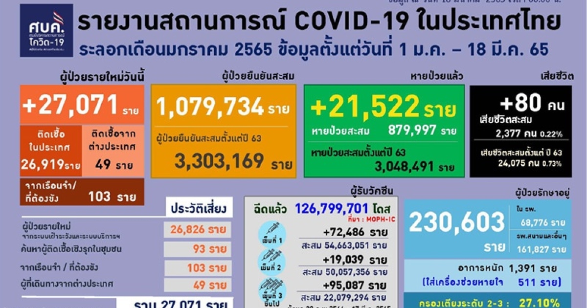 สำนักข่าวอิศรา (www.isranews.org) รายงานว่า เมื่อวันที่ 18 มี.ค. 2565 นพ.ทวีศิบป์ วิษณุโยธิน โฆษกศูนย์บริหารสถาการณ์โควิด-19 (ศบค.) รายงานสถานการณ์ประจำวัน โดยพบผู้ป่วยรายใหม่ 27,071 ราย จำแนกเป็น ติดเชื้อในประเทศ 26,919 ราย เกิดจากระบบเฝ้าระวังและระบบบริการฯ 26,826 ราย เกิดจากการค้นหาเชิงรุกและพบการติดเชื้อในชุมชน 93 ราย ติดเชื้อภายในเรือนจำ 103 ราย อีก 49 รายเดินทางกลับมาจากต่างประเทศ รวมผู้ป่วยสะสม 3,303,169 ราย