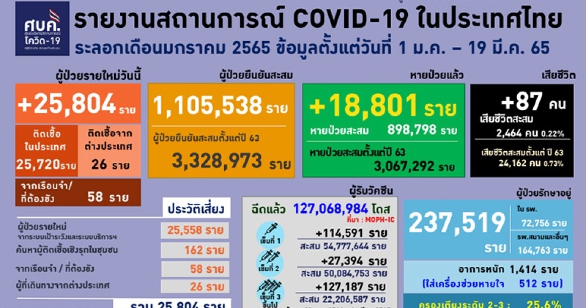 สำนักข่าวอิศรา (www.isranews.org) รายงานว่า เมื่อวันที่ 19 มี.ค. 2565 ศูนย์บริหารสถาการณ์โควิด-19 (ศบค.) รายงานสถานการณ์ประจำวัน โดยพบผู้ป่วยรายใหม่ 25,804 ราย จำแนกเป็น ติดเชื้อในประเทศ 25,778 ราย เกิดจากระบบเฝ้าระวังและระบบบริการฯ 25,558 ราย เกิดจากการค้นหาเชิงรุกและพบการติดเชื้อในชุมชน 162 ราย ติดเชื้อภายในเรือนจำ 58 ราย อีก 26 รายเดินทางกลับมาจากต่างประเทศ รวมผู้ป่วยสะสม 3,328,973 ราย