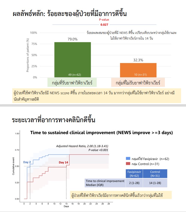 ผลการศึกษาพบว่า กลุ่มที่ได้รับยาฟาวิพิราเวียร์ มีอาการดีขึ้น 79% เมื่อเทียบกับกลุ่มที่ไม่ได้รับยาฟาวิพิราเวียร์ ดังนั้น 2 กลุ่มนี้ จะเห็นว่าการให้ยาทำให้ผู้ป่วยอาการดีขึ้น อย่างมีนัยสำคัญทางสถิติ ทำให้คณะผู้วิจัยมีความมั่นใจว่ายาฟาวิพิราเวียร์ทำให้อาการดีขึ้น จึงได้ข้อสรุปว่า ยาฟาวิพิราเวียร์ที่ให้วันละ 1,800 มก.วันละ 2 ครั้งในวันแรก และต่อด้วยขนาด 800 มก.วันละ 2 ครั้งในวันต่อมานานอีก 4 วัน เป็นยาที่ควรเริ่มเร็วและช่วยลดอาการป่วยได้สำหรับผู้ป่วยอาการไม่รุนแรงอย่างมีนัยสำคัญกว่าการไม่รับยา