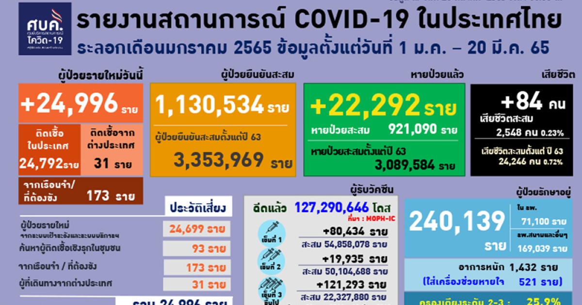 สำนักข่าวอิศรา (www.isranews.org) รายงานว่า เมื่อวันที่ 20 มี.ค.2565 ศูนย์บริหารสถาการณ์โควิด-19 (ศบค.) รายงานสถานการณ์ประจำวัน โดยพบผู้ป่วยรายใหม่ 24,996 ราย จำแนกเป็น ติดเชื้อในประเทศ 24,792 ราย เกิดจากระบบเฝ้าระวังและระบบบริการฯ 24,699 ราย เกิดจากการค้นหาเชิงรุกและพบการติดเชื้อในชุมชน 93 ราย ติดเชื้อภายในเรือนจำ 173 ราย อีก 31 รายเดินทางกลับมาจากต่างประเทศ รวมผู้ป่วยสะสม 3,353,969 ราย