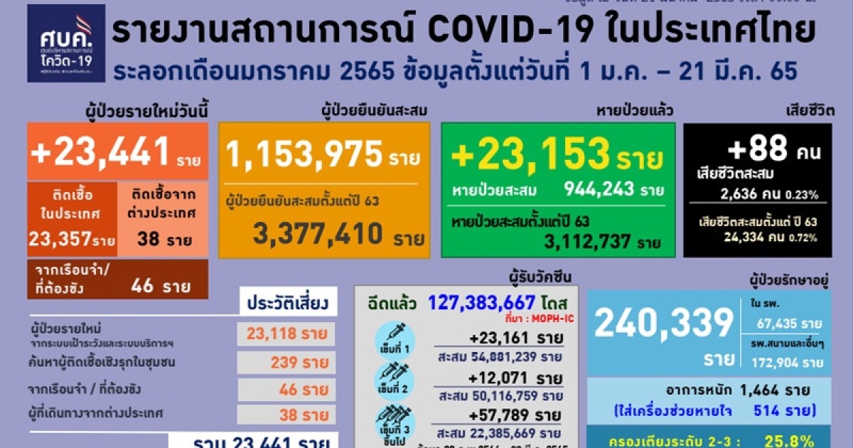 สำนักข่าวอิศรา รายงานสถานการณ์การแพร่ระบาดเชื้อไวรัสโควิด -19 ประเทศไทย ประจำวันที่ 21 มีนาคม 2565 ว่า มีผู้ติดเชื้่อใหม่ 23,441 ราย
