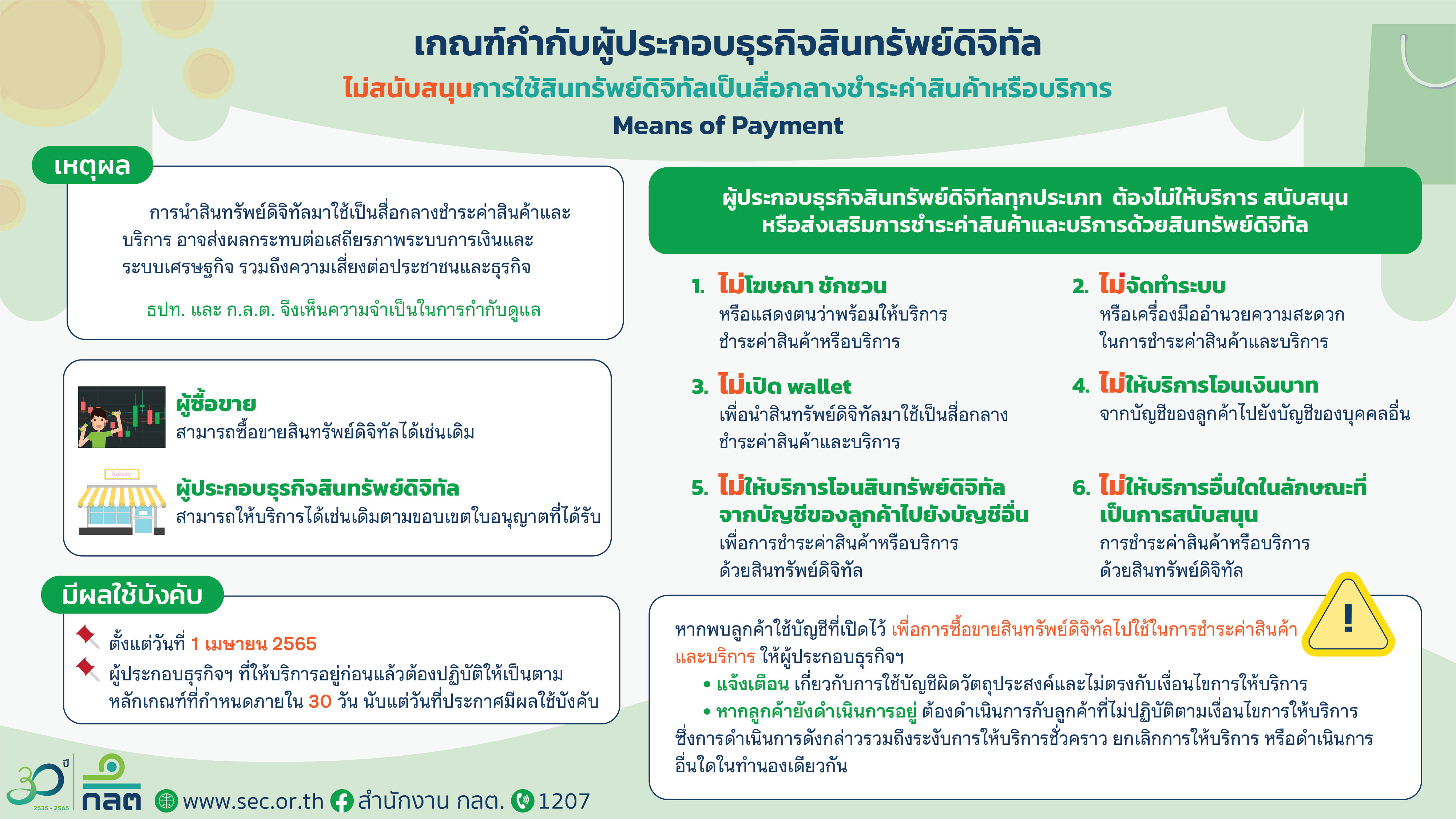 เมื่อวันที่ 23 มี.ค. สำนักงานคณะกรรมการกำกับหลักทรัพย์และตลาดหลักทรัพย์ (สำนักงาน ก.ล.ต.) แจ้งว่า ตั้งแต่วันที่ 1 เม.ย. เป็นต้นไป ประกาศหลักเกณฑ์ห้ามมิให้ผู้ประกอบธุรกิจสินทรัพย์ดิจิทัลให้บริการที่เกี่ยวข้องกับการนำสินทรัพย์ดิจิทัลมาใช้เป็นสื่อกลางในการชำระค่าสินค้าและบริการ จะมีผลบังคับใช้ โดยให้ผู้ประกอบธุรกิจสินทรัพย์ดิจิทัลที่ให้บริการอยู่ก่อนแล้ว ต้องปฏิบัติให้เป็นไปตามที่หลักเกณฑ์กำหนดภายใน 30 วันนับแต่วันที่ประกาศมีผลใช้บังคับ