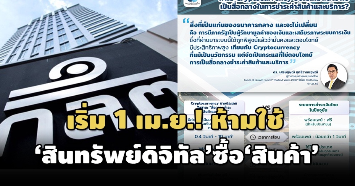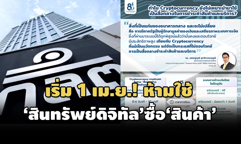 ก.ล.ต.เผยประกาศหลักเกณฑ์ห้ามใช้ ‘สินทรัพย์ดิจิทัล’ ซื้อ ‘สินค้า-บริการ’ มีผลบังคับใช้ 1 เม.ย.นี้ ให้เวลาผู้ประกอบการฯปรับตัว 30 วัน ขณะที่ ‘ธปท.’ แพร่ข้อมูลเทียบ 5 จุดอ่อนการใช้ ‘คริปโทฯ’ ชำระค่าสินค้า ระบุมีค่าธรรมเนียม-เสี่ยงภัยไซเบอร์