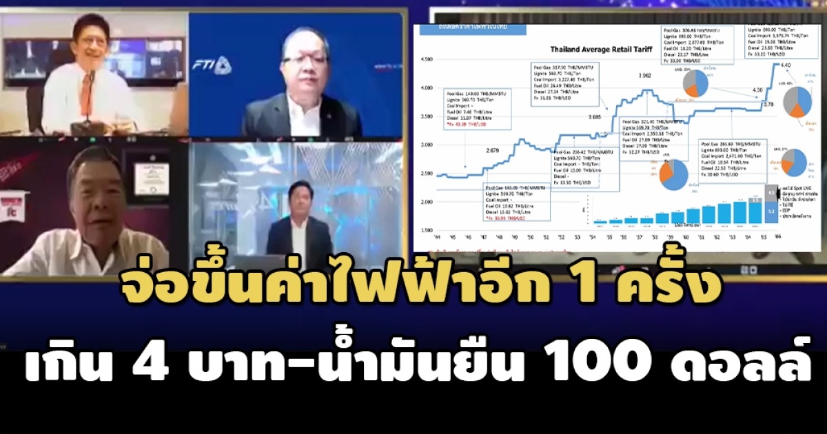 วงเสวนาประเมินราคาน้ำมันดิบปีนี้ยืน 100 ดอลล์ เหตุสงคราม ‘รัสเซีย-ยูเครน’ จบ แต่การ ‘แซงชั่น’ ไม่จบ ‘เลขาฯกกพ.’ รับเตรียมขึ้นค่าไฟฟ้าอีก 1 ครั้งในปีนี้ ดันราคาไปแตะ 4 บาทกว่าๆ ด้าน ‘สอท.’ ชี้ขึ้นค่าไฟฟ้า ต้นทุน 45 อุตสาหกรรม พุ่ง 2-5%