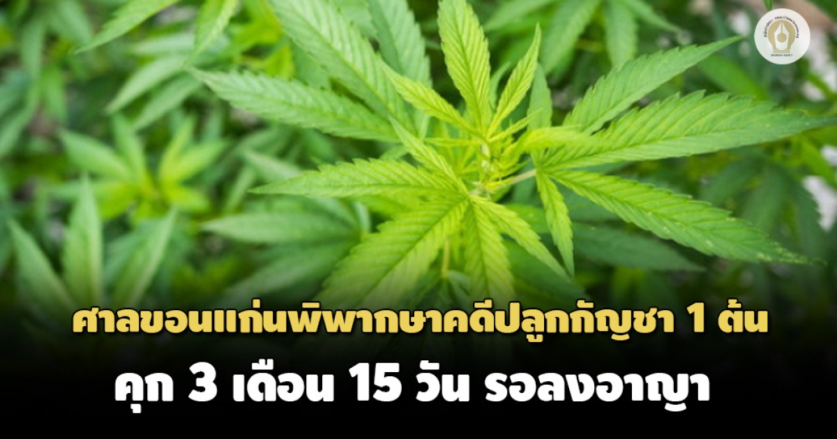 ศาลจังหวัดขอนแก่น พิพากษาคดีปลูกกัญชา 1 ต้น โทษจำคุก 3 เดือน 15 วัน รอลงอาญา 2 ปี ปรับ 17,500 บาท พร้อมคุมประพฤติ 1 ปี ระบุ ประมวลกฎหมายยาเสพติด ยังบัญญัติให้การผลิต-ครอบครองกัญชา เป็นยาเสพติดให้โทษประเภท 5