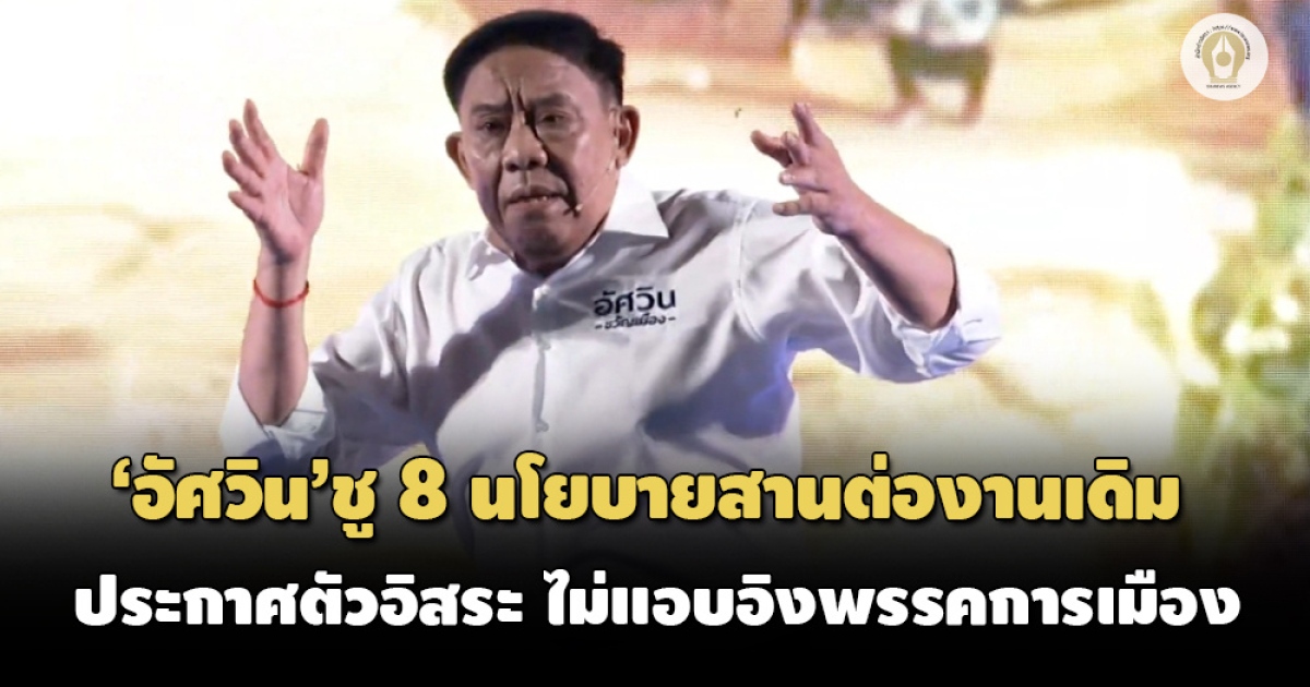 “ขอยืนยันว่า อัศวิน ขวัญเมือง อิสระอย่างแท้จริง ผมทำงานร่วมกับคนบางกลุ่ม แต่ไม่ใช่พรรคการเมือง ผมมีความอิสระ ไม่แอบอิงพรรคหนึ่งพรรคใด ผมมีเอกภาพในการทำงาน ตัดสินใจได้เอง พร้อมทีมงานของผม” พล.ต.อ.อัศวิน กล่าว