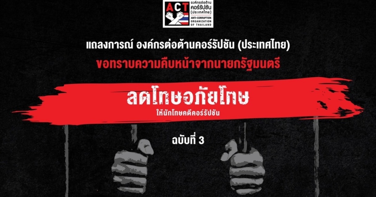 สำนักข่าวอิศรา (www.isranews.org) รายงานว่าเมื่อวันที่ 29 มีนาคม 2565 องค์กรต่อต้านคอร์รัปชัน (ประเทศไทย) หรือ ACT ออกแถลงการณ์ เรื่อง ขอทราบความคืบหน้าจากท่านนายกรัฐมนตรี กรณีการลดโทษอภัยโทษให้นักโทษคดีคอร์รัปชัน ฉบับที่ 3 โดยเนื้อหาในแถลงการณ์ ระบุ ดังนี้