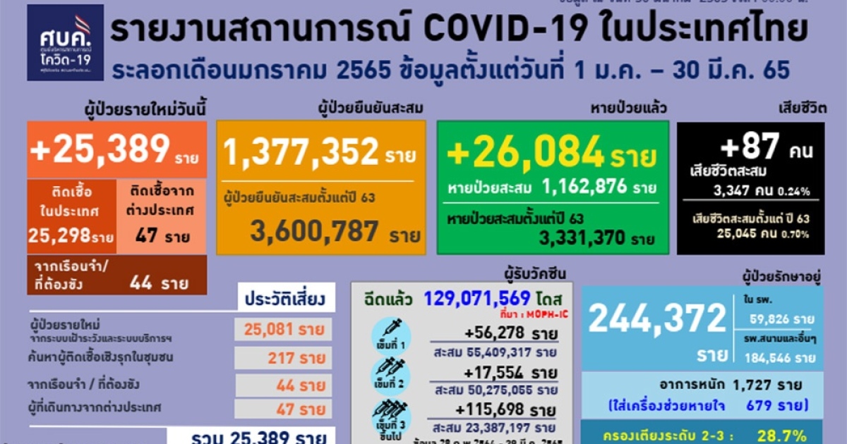 โควิด 30 มี.ค. ป่วยเพิ่ม 25,389 ยอด ATK 25,397 เสียชีวิต 87 ปอดอักเสบ 1,727 ราย