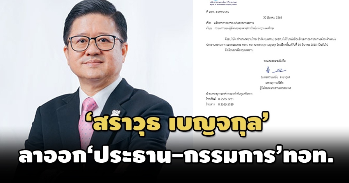 สำนักข่าวอิศรา (www.isranews.org) รายงานว่า เมื่อวันที่ 30 มี.ค. บริษัท ท่าอากาศยานไทย จำกัด (มหาชน) หรือ ทอท. แจ้งตลาดหลักทรัพย์ฯ เรื่อง แจ้งการลาออกของประธานกรรมการ โดยระบุว่า บริษัท ท่าอากาศยานไทย จำกัด (มหาชน) ได้รับหนังสือแจ้งขอลาออกจากการดำรงตำแหน่ง ประธานกรรมการ และกรรมการ ทอท. ของ นายสราวุธ เบญจกุล โดยมีผลตั้งแต่วันที่ 30 มี.ค.2565 เป็นต้นไป