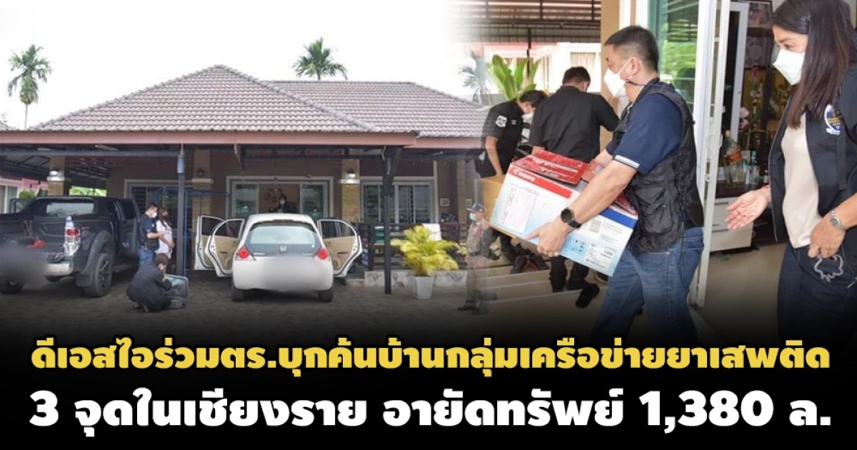 DSI สนธิกำลังตำรวจ บุกค้นบ้านพักกลุ่มเครือข่ายยาเสพติด 3 จุดในพื้นที่เชียงราย ภายใต้ปฏิบัติการ “พาลีปราบยา” อายัดทรัพย์ลอตใหญ่ เงินฝาก 246 บัญชี รถยนต์ มอเตอร์ไซค์ 155 คัน ที่ดิน 232 แปลง เบ็ดเสร็จ 1,380 ล้าน