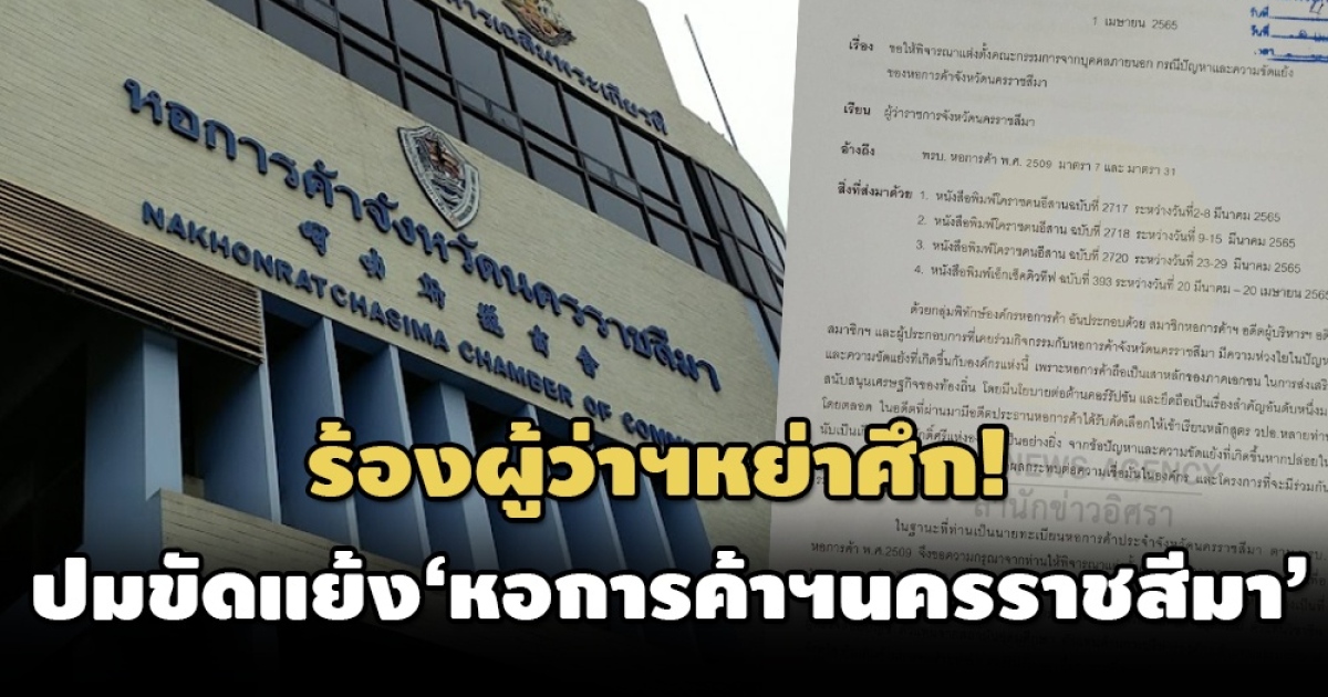 ‘กลุ่มพิทักษ์องค์กรหอการค้า’ ยื่นหนังสือถึง ‘ผู้ว่าฯโคราช’ ขอให้ช่วยหย่าศึกปมขัดแย้งภายใน ‘หอการค้าฯนครราชสีมา’ หลังมีการฟ้องร้อง ปมยกหนี้ ‘โครงการพันธมิตร’ 7 แสนบาท เสนอตั้ง 'คณะกรรมการฯ' จากคนภายนอก ตรวจสอบ 4 ประเด็น