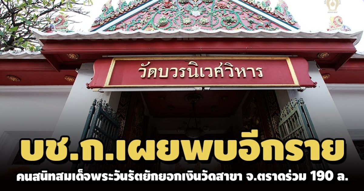 พบอีกราย คนสนิทสมเด็จพระวันรัตยักยอกเงิน วัดสาขา จ.ตราด บช.ก.คาดยอดเงินรวมอาจจะสูงกว่า 190 ล้าน ชี้ผู้ต้องหารายเดิมยักยอกเงินวัด ใน จ.ตราดอีก 2 แห่งร่วม 90 ล้าน