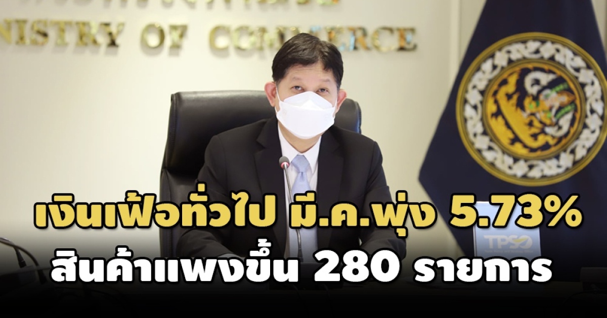 ‘พาณิชย์’ เผยอัตราเงินเฟ้อทั่วไปเดือน มี.ค. ขยายตัว 5.73% สูงสุดในรอบ 13 ปี เหตุราคาพลังงาน-อาหารแพง พบสินค้ามีราคาแพงขึ้น 280 รายการ พร้อมปรับคาดการณ์เงินเฟ้อทั้งปี 65 เป็นเพิ่มขึ้น 4-5%