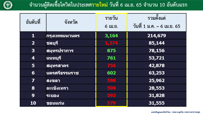สำหรับ 10 จังหวัดที่มีผู้ติดเชื้อโควิดรายใหม่สูงสุด ตามลำดับ ได้แก่ กทม. 3,164 ราย ชลบุรี 1,274 ราย สมุทรปราการ 875 ราย นนทบุรี 761 ราย สมุทรสาคร 756 ราย นครศรีธรรมราช 602 ราย สงขลา 598 ราย ฉะเชิงเทรา 598 ราย ระยอง 592 ราย ขอนแก่น 579 ราย
