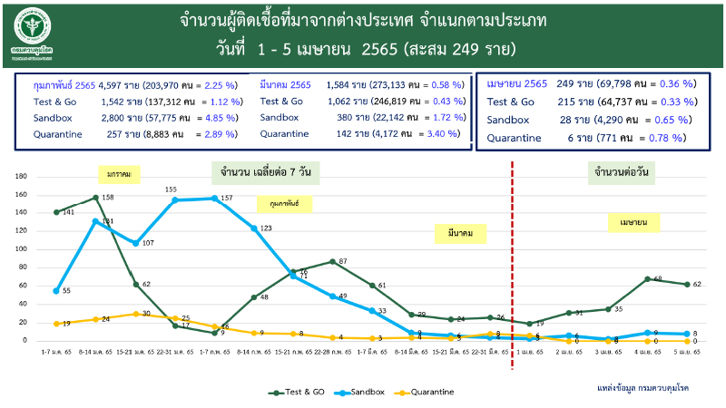 ทำให้ผู้ติดเชื้อจากต่างประเทศ เดือน เม.ย. สะสมรวม 249 ราย จำแนกเป็น แบบไม่ต้องกักตัว (Test and Go) 215 ราย แบบแซนด์บ็อกซ์ (Sandbox) 28 ราย แบบกักตัว (Quarantine) 6 ราย
