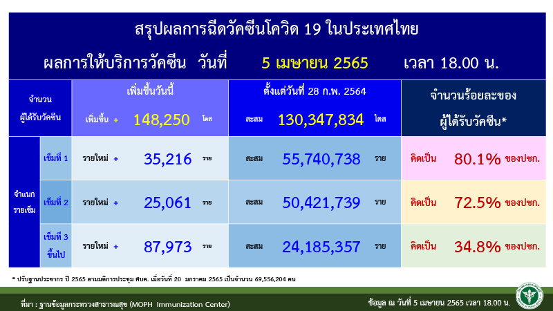 ขณะที่ การกระจายวัคซีนในประเทศ เมื่อวันที่ พบผู้ที่ได้รับผู้ที่ได้รับวัคซีนเข็มที่ 1 เพิ่มเติม จำนวน 35,216 ราย ผู้ได้รับเข็มที่ 2 จำนวน 25,061 ราย และผู้ได้รับเข็มที่ 3 จำนวน 87,973 ราย รวมสะสมผู้ได้รับวัคซีนแล้ว 130,347,834 ราย แบ่งเป็น ผู้ได้รับเข็มที่ 1 จำนวน 55,740,738 ราย คิดเป็น 80.1% ผู้ได้รับเข็มที่ 2 จำนวน 50,421,739 ราย คิดเป็น 72.5% และผู้ได้รับเข็มที่ 3 จำนวน 24,185,357 ราย คิดเป็น 34.8%