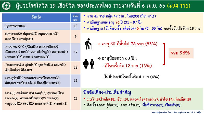 ด้านผู้เสียชีวิต 94 ราย มาจาก กทม. 12 ราย ปริมณฑล 8 ราย ภาคตะวันออกเฉียงเหนือ 19 ราย ภาคเหนือ 16 ราย ภาคใต้ 13 ราย และภาคกลาง 26 ราย แบ่งเป็นชาย 45 ราย หญิง 49 ราย อายุระหว่าง 31-97 ปี ค่ามัธยฐานวันที่พบเชื้อ-เสียชีวิต 5 วัน และพบเชื้อวันเสียชีวิต 18 ราย