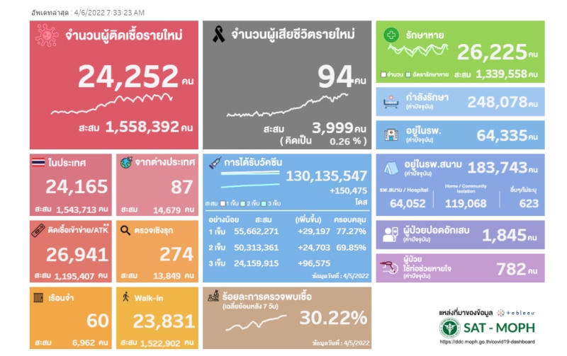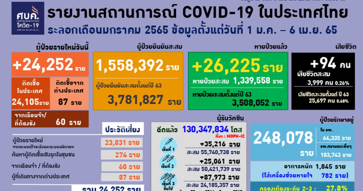 สำนักข่าวอิศรา (www.isranews.org) รายงานว่า เมื่อวันที่ 6 เม.ย.2565 ศูนย์บริหารสถานการณ์โควิด-19 (ศบค.) รายงานสถานการณ์ประจำวัน โดยพบผู้ป่วยรายใหม่ 24,252 ราย จำแนกเป็น ติดเชื้อในประเทศ 24,105 ราย เกิดจากระบบเฝ้าระวังและระบบบริการฯ 23,831 ราย เกิดจากการค้นหาเชิงรุกและพบการติดเชื้อในชุมชน 274 ราย ติดเชื้อภายในเรือนจำ 60 ราย อีก 87 รายเดินทางกลับมาจากต่างประเทศ รวมผู้ป่วยสะสม 3,781,827 ราย