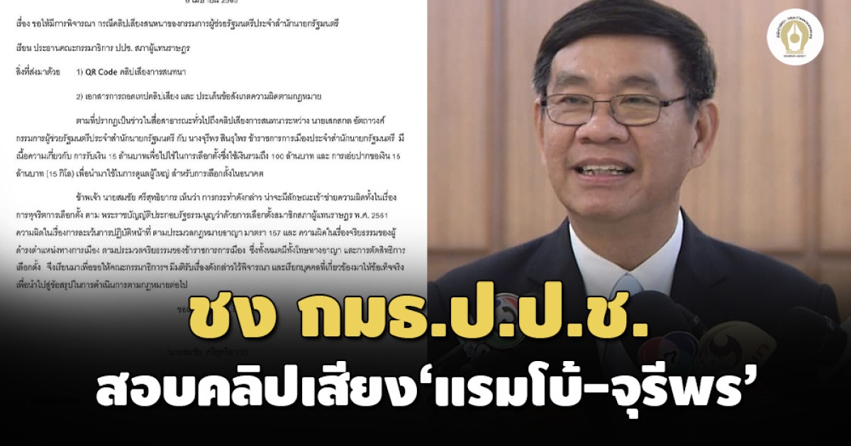 ‘สมชัย’ร้อง กมธ.ป.ป.ช. สอบคลิปเสียง ‘แรมโบ้-จุรีพร’ ปมเงินหวย 15 ล้านบาท ด้าน ‘เสรีพิศุทธ์’ โวคดีง่ายๆ เพราะเจ้าตัวสารภาพหมดแล้ว ขณะที่ ‘บิ๊กตู่’ ย้ำผิดเป็นผิด ถูกเป็นถูก ไม่ขัดข้องที่ กมธ.สอบเรื่องนี้