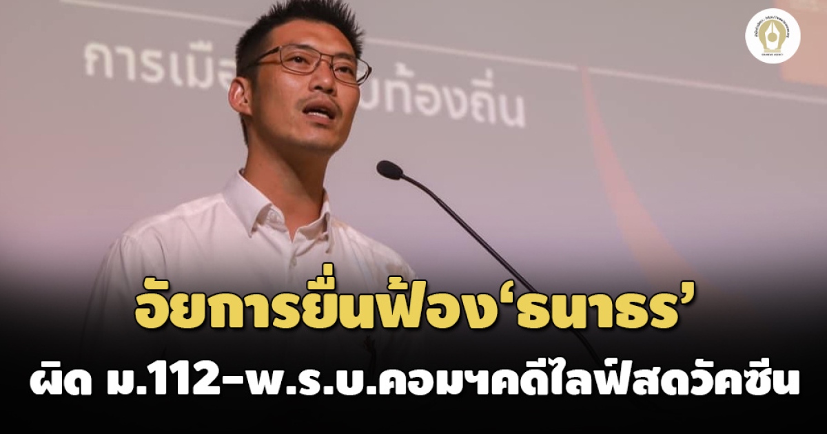 อัยการมีคำสั่งฟ้อง ‘ธนาธร จึงรุ่งเรืองกิจ’ ความผิดตามมาตรา 112 - พ.ร.บ.คอมฯ กรณีไลฟ์สดวิพากษ์วิจารณ์วัคซีนโควิดที่มีความล่าช้าและมีเนื้อหาพาดพิงสถาบัน ล่าสุดศาลอาญาอนุญาตให้ประกัน ตีราคา 9 หมื่นบาท กำหนดเงื่อนไขห้ามกระทำการใดๆ ทำนองเดียวกันกับที่ถูกกล่าวหา