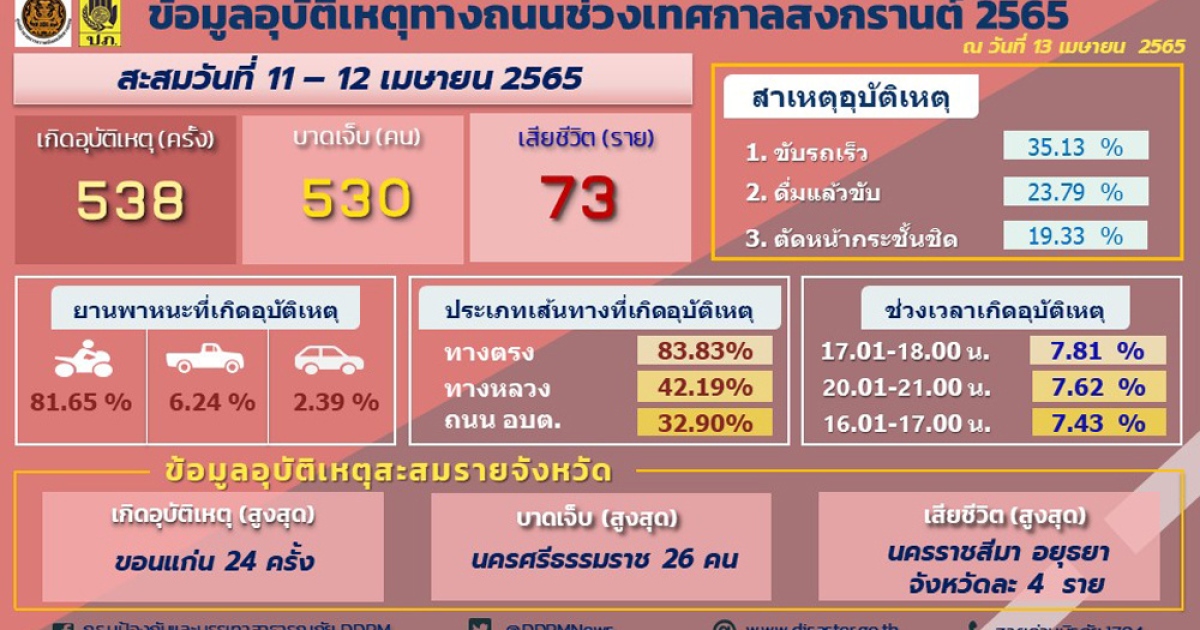 สรุปสถิติอุบัติเหตุทางถนนสะสม 2 วัน (วันที่ 11 – 12 เมษายน 2565) เกิดอุบัติเหตุรวม 538 ครั้ง ผู้เสียชีวิต 73 ราย ผู้บาดเจ็บ 530 คน สาเหตุหลักยังคงเกิดจากการขับรถเร็วและการดื่มแล้วขับ พฤติกรรมเสี่ยง ที่ทำให้บาดเจ็บและเสียชีวิตสูงสุด คือ ไม่สวมหมวกนิรภัย