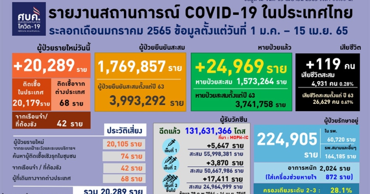 สำนักข่าวอิศรา (www.isranews.org) รายงานว่า เมื่อวันที่ 15 เม.ย. 2565 ศูนย์บริหารสถาการณ์โควิด-19 (ศบค.) รายงานสถานการณ์ประจำวัน โดยพบผู้ป่วยรายใหม่ 20,289 ราย จำแนกเป็น ติดเชื้อในประเทศ 20,179 ราย เกิดจากระบบเฝ้าระวังและระบบบริการฯ 20,105 ราย เกิดจากการค้นหาเชิงรุกและพบการติดเชื้อในชุมชน 74 ราย ติดเชื้อภายในเรือนจำ 42 ราย อีก 68 รายเดินทางกลับมาจากต่างประเทศ รวมผู้ป่วยสะสม 3,993,292 ราย