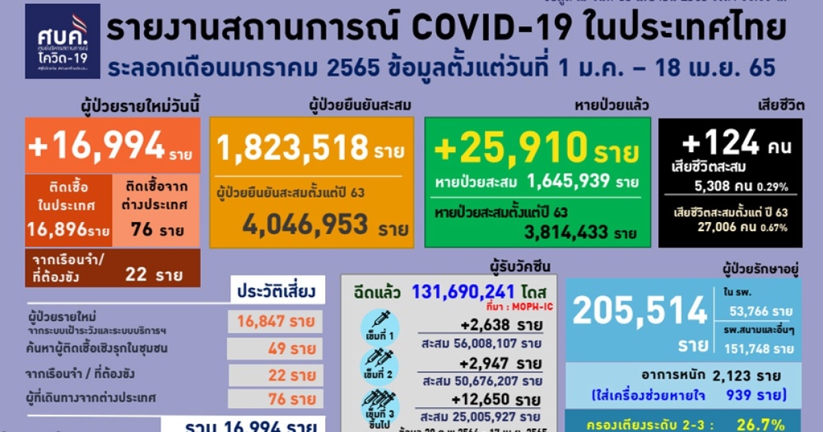 สำนักข่าวอิศรา (www.isranews.org) รายงานว่า เมื่อวันที่ 18 เม.ย. 2565 ศูนย์บริหารสถาการณ์โควิด-19 (ศบค.) รายงานสถานการณ์ประจำวัน โดยพบผู้ป่วยรายใหม่ 16,994 ราย จำแนกเป็น ติดเชื้อในประเทศ 16,918 ราย เกิดจากระบบเฝ้าระวังและระบบบริการฯ 16,847 ราย เกิดจากการค้นหาเชิงรุกและพบการติดเชื้อในชุมชน 49 ราย ติดเชื้อภายในเรือนจำ 22 ราย อีก 76 รายเดินทางกลับมาจากต่างประเทศ รวมผู้ป่วยสะสม 4,046,953 ราย