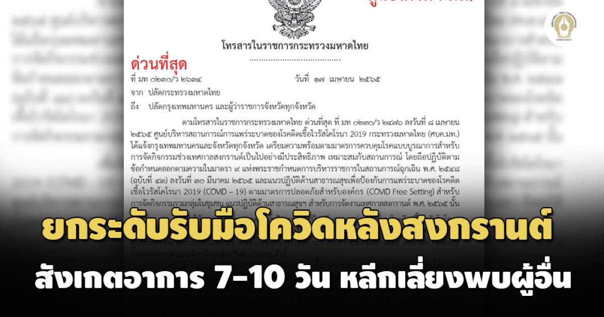 ผู้สื่อข่าวรายงานว่า เมื่อวันที่ 17 เม.ย.2565 นายสุทธิพงษ์ จุลเจริญ ปลัดกระทรวงมหาดไทย มีโทรสารในราชการกระทรวงมหาดไทยถึงปลัดกรุงเทพมหานคร และผู้ว่าราชการจังหวัดทุกจังหวัด แจ้งว่า เพื่อให้การปฏิบัติตามมาตราการเฝ้าระวังและป้องกันการแพร่ระบาดของโควิด หลังเทศกาลสงกรานต์ 2565 เป็นไปอย่างมีประสิทธิภาพ เหมาะสมกับสถานการณ์ศูนย์บริหารสถานการณ์การแพร่ระบาดของโรคติดเชื้อไวรัสโคโรนา 2019 กระทรวงมหาดไทย (ศบค.มท.) ขอให้ กทม.และทุกจังหวัดดำเนินการ ดังนี้