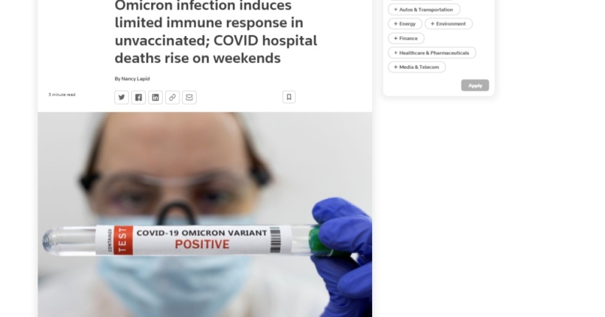 สำนักข่าวอิศรา (www.isranews.org) รายงานสถานการณ์เกี่ยวกับการระบาดของไวรัสโควิด-19 หรือโคโรนาไวรัสว่ามีการสรุปผลการวิจัยเกี่ยวกับไวรัสโควิด-19 ซึ่งยังไม่ได้ผ่านการทบทวนทางวิชาการพบข้อมูลว่าการติดเชื้อไวรัสโควิดสายพันธุ์โอไมครอนนั้นจะไปจำกัดการทำงานของระบบภูมิคุ้มกันของร่างกาย ซึ่งถ้าหากผู้ที่ยังไม่ได้รับการฉีดวัคซีนป้องกันไวรัสได้ติดเชื้อไวรัสโควิดสายพันธุ์โอไมครอนเมื่อติดเชื้อดังกล่าวไปแล้ว พบว่าจะไม่สร้างภูมิคุ้มกันต่อไวรัสโควิดสายพันธุ์อื่นๆแต่อย่างใด