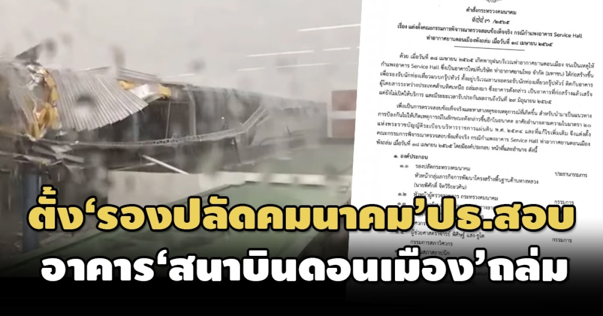 'ทอท.' ตั้งกรรมการตรวจสอบฯ เหตุอาคารผู้โดยสารระหว่างประเทศ ‘สนามบินดอนเมือง’ ถล่ม หลังลมพายุกระโชก ขณะที่ 'คมนาคม' ตั้งคณะกรรมการตรวจสอบฯอีก 1 ชุด ดึง วสท.-สภาวิศวกร-สภาสถาปนิก' ร่วมตรวจสอบ