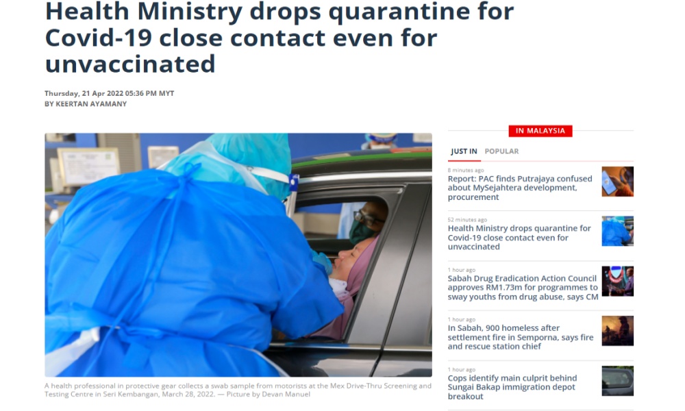 'มาเลเซีย' เคาะพรุ่งนี้ กลุ่มสัมผัสเสี่ยงสูงไม่ตั้งกักตัวเอง แม้ยังไม่ฉีดวัคซีนก็ตาม ส่วนผู้มีอาการให้ตรวจ ATK ทุกสามวันพร้อมกักตัวจนผลเป็นลบและอาการดีขึ้น ส่วนผู้ไม่มีอาการไม่ต้องกักตัวแต่ให้ดำเนินการตามมาตรการป้องกันโรคเคร่งครัดอย่างน้อยห้าวัน
