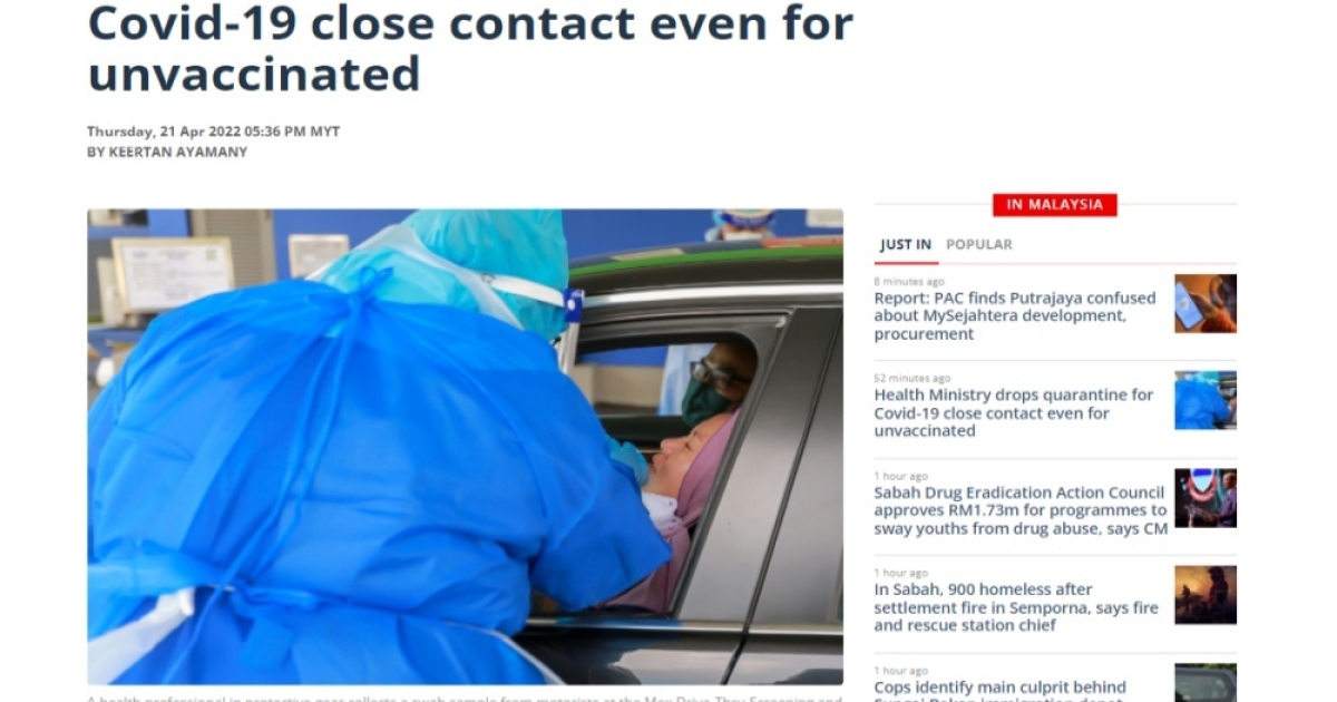 สำนักข่าวอิศรา (www.isranews.org) รายงานสถานการณ์เกี่ยวกับการระบาดของไวรัสโควิด-19 หรือโคโรน่าไวรัสว่าที่ประเทศมาเลเซียนั้นได้กำหนดให้ในวันพรุ่งนี้ หรือว่าวันที่ 22 เม.ย. นั้น จะไม่มีการกักตัวกลุ่มที่เป็นผู้สัมผัสเสี่ยงสูงจากการติดเชื้อไวรัสโควิด-19 อีกต่อไป โดยไม่แบ่งแยกว่าผู้มีความเสี่ยงสูงดังกล่าวนั้นจะเป็นผู้ที่ฉีดวัคซีนหรือว่ายังฉีดวัคซีนก็ตาม