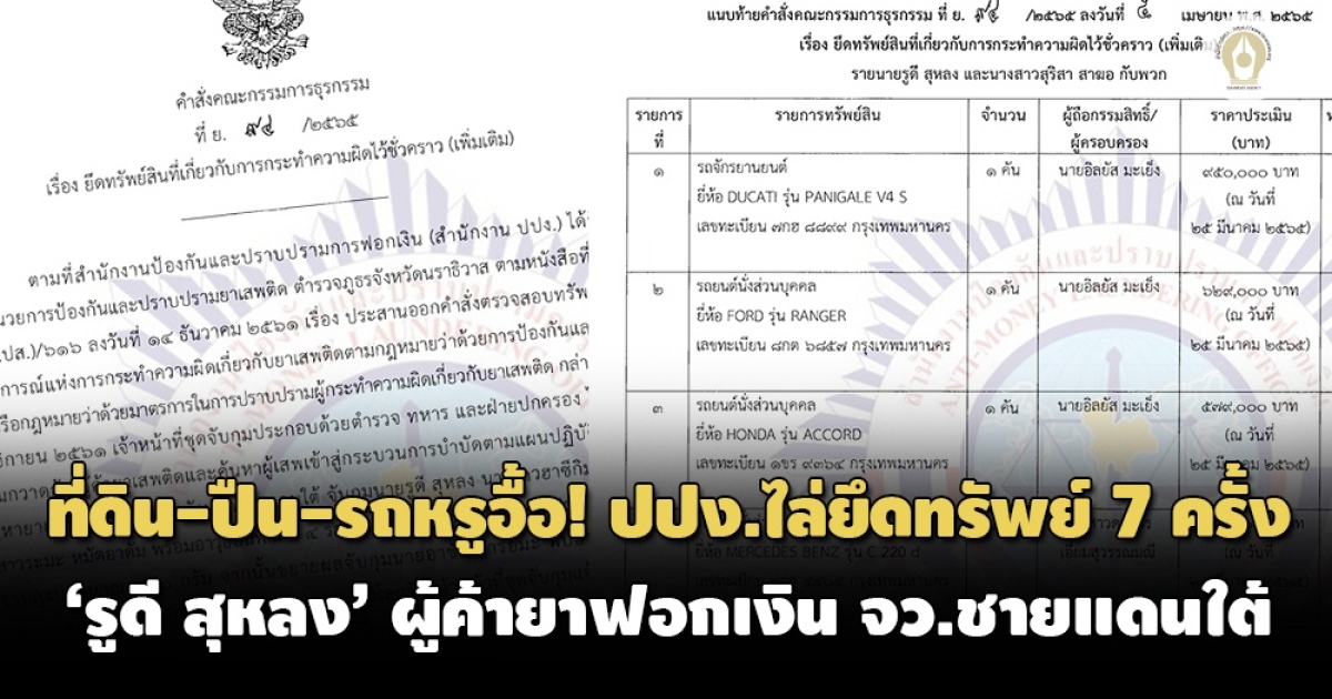 ก่อนหน้าปี 2562-2564 โดน 6 ครั้ง 83 รายการ! ปปง.ไล่ยึดอายัดทรัพย์สิน ‘รูดี สุหลง-ฮาซีกิม อับดุลเลาะห์’ ผู้ค้ายาเสพติดรายใหญ่ จว.ชายแดนใต้ ครั้งที่ 7 รถยนต์ มอเตอร์ไซค์ ยี่ห้อดัง 11 คัน 9 ล้าน ขณะที่เจ้าตัวถูกศาลจำคุก 51 ปี 3 เดือน คดีครอบครองอาวุธปืน ค้าเฮโรอีน