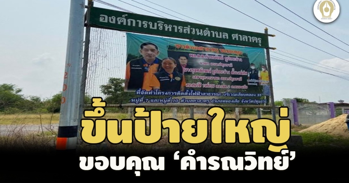 อบต.ศาลาครุ อ.หนองเสือ ขึ้นป้ายขอบคุณ ‘คำรณวิทย์’ นายก อบจ.ปทุมธานี ติดตั้งไฟส่องสว่างในพื้นที่ 210 ต้น 9.13 ล. เฉลี่ยต้นละ 43,476.19 บาท