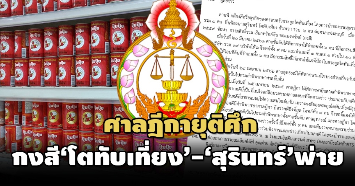ศาลฎีกาฯ ยุติศึกกงสีตระกูล ‘โตทับเที่ยง’ สั่ง ‘สุรินทร์-พวก’ สั่งโอน ‘หุ้น 19 บริษัท-ที่ดิน’ แบ่งพี่น้อง คนละ 1 ส่วน ขณะที่ 9 พี่น้องโตทับเที่ยง นำโดยพี่ใหญ่ ‘สุธรรม โตทับเที่ยง’ ตั้งโต๊ะแถลงผลคดี 28 เม.ย.นี้
