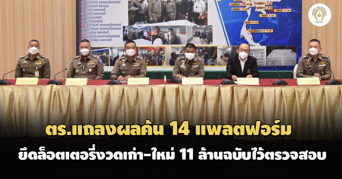 ตำรวจแถลงผลตรวจค้น 14 แพลตฟอร์ม 34 จุดทั่วประเทศ ยึดล็อตเตอรี่งวดเก่า-ใหม่ รวม 11 ล้านฉบับ ก่อนนำไปตรวจสอบว่าเข้าองค์ประกอบความผิดหรือไม่ ‘บิ๊กโจ๊ก’เชื่อปัญหาหวยแพงจะค่อยๆ ดีขึ้น