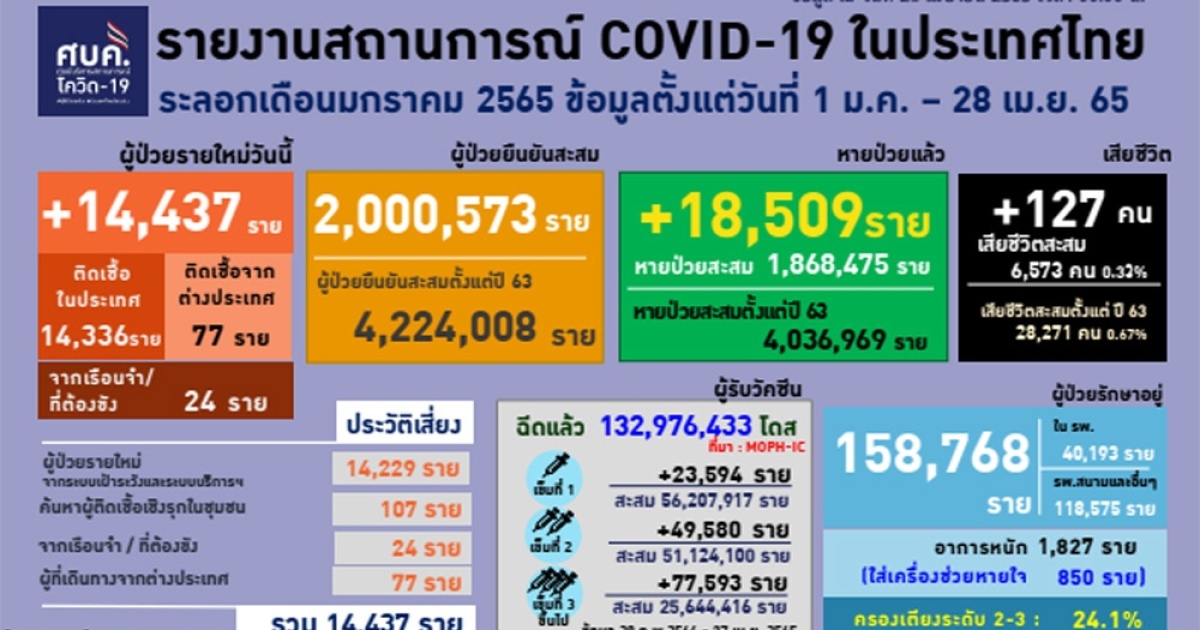 สำนักข่าวอิศรา (www.isranews.org) รายงานว่า เมื่อวันที่ 28 เม.ย. 2565 ศูนย์บริหารสถาการณ์โควิด-19 (ศบค.) รายงานสถานการณ์ประจำวัน โดยพบผู้ป่วยรายใหม่ 14,437 ราย จำแนกเป็น ติดเชื้อในประเทศ 14,360 ราย เกิดจากระบบเฝ้าระวังและระบบบริการฯ 14,229 ราย เกิดจากการค้นหาเชิงรุกและพบการติดเชื้อในชุมชน 107 ราย ติดเชื้อภายในเรือนจำ 24 ราย อีก 77 รายเดินทางกลับมาจากต่างประเทศ รวมผู้ป่วยสะสม 4,224,008 ราย