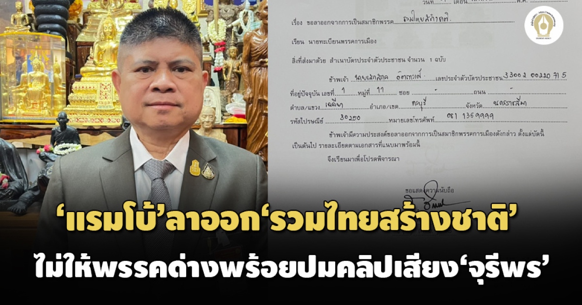 ‘เสกสกล อัตถาวงศ์’ ลาออกพ้นสมาชิกพรรค ‘รวมไทยสร้างชาติ’ ระบุเพื่อไม่ให้เกิดความด่างพร้อยและความลำบากใจต่อ กก.บห. ปมคลิปหวย